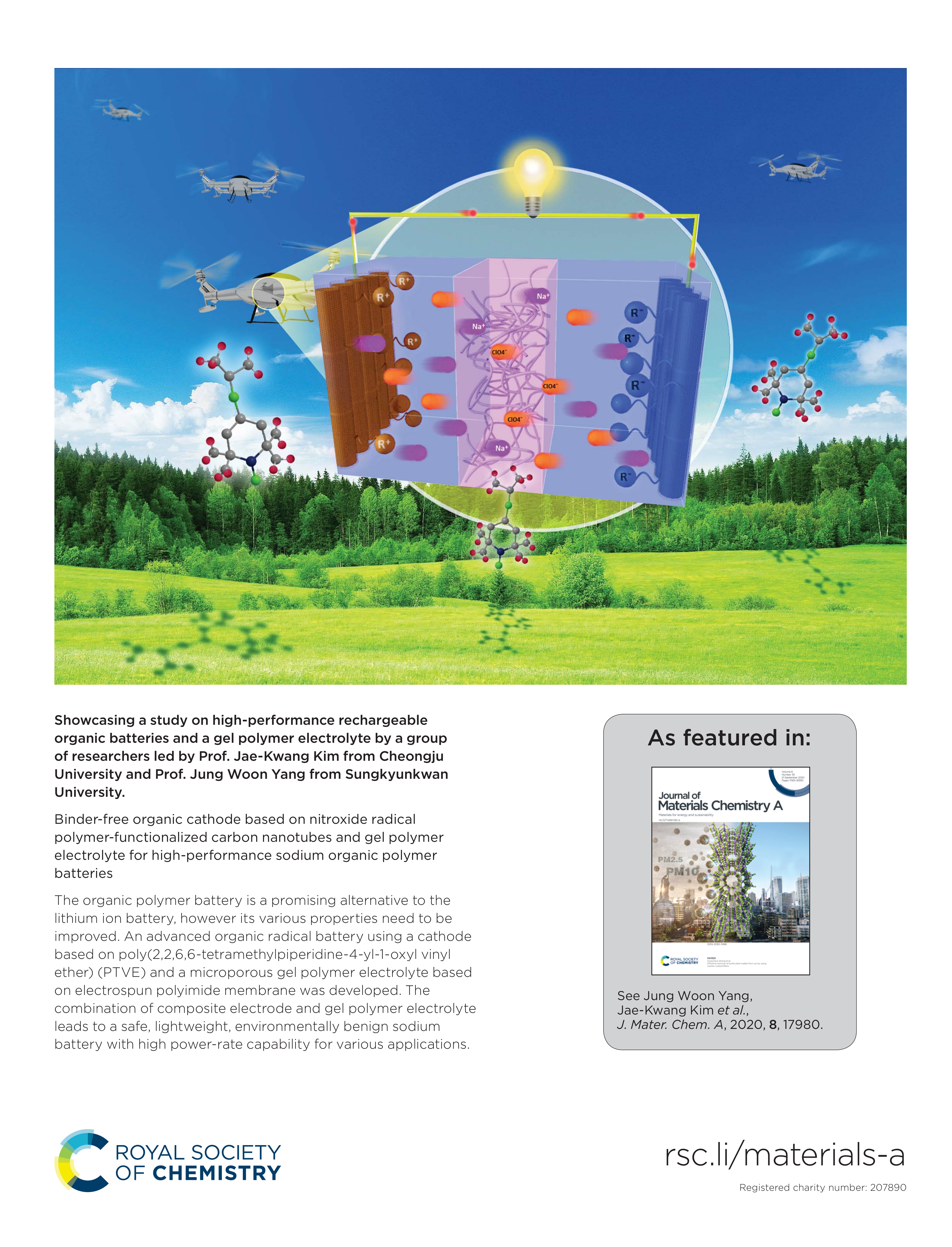 "Binder-free organic cathode based on nitroxide radical polymer-functionalized carbon nanotubes and gel polymer electrolyte for high-performance sodium organic polymer batteries", J. Mater. Chem. A, 2020, 8, 17980-17986 (Selected as Back Cover).