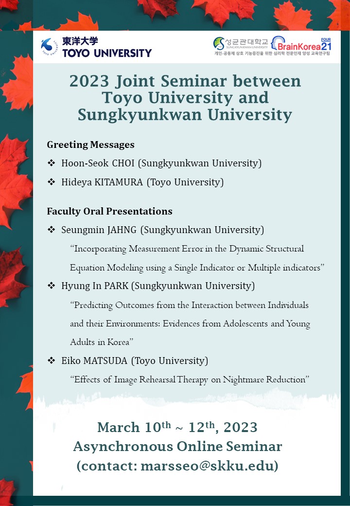 관심 있는 분들의 많은 참여 부탁드립니다. ○ 행사명: 2023 SKKU-TOYO University Joint Seminar ○ 일시: 2023. 3. 10 ~ 3. 12 ○ 방법: Online Asynchronous Seminar 자세한 사항은 marsseo@skku.edu로 문의하여 주십시오. 감사합니다. |