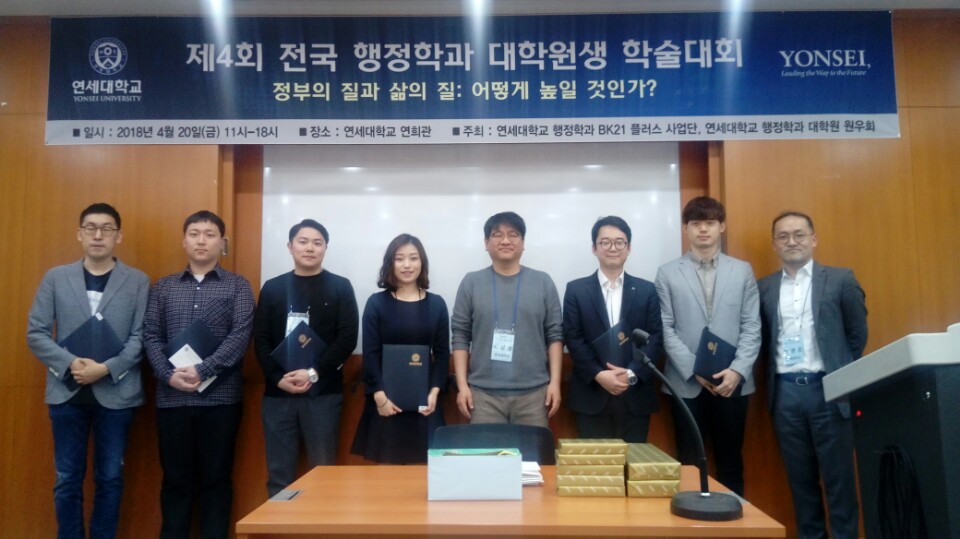 우리대학 국정전문대학원 공공인재개발연구센터의 서은혜(석사 3기)연구원, 이효주(박사수료)연구원, 박성민(지도교수) 팀이 2018년 4월 20일 연세대학교 연희관에서 개최된 제4회 전국 행정학과 대학원생 학술대회에서 발표된 30편의 전국 행정학과 대학원생 논문 세션 전체 참가자 중에서 최우수상(1등)을 수상하였다. 서은혜(석사 3기), 이효주(박사수료), 박성민(지도교수)는 ‘대한민국 공무원 동기유형과 조직효과성, 삶의 질에 관한 연구 - 자기결정성 이론(SDT)을 중심으로’라는 논문을 발표하여 학술적 우수성과 연구의 참신성을 인정받아 최우수상을 수상하게 되었다. 이 날 개최된 전국 행정학과 대학원생 학술대회는 행정학 및 정책학 관련 학문을 전공하고 있는 대학원생들의 연구 능력을 고양하며 학문후속세대의 학술 교류를 활성화하기 위한 목적을 갖고 있다. 또한 다양한 이론적 접근과 방법론을 통해 행정학 및 정책학에 대한 이해를 높이고 참신한 연구주제를 고찰하는 학술대회이다. |