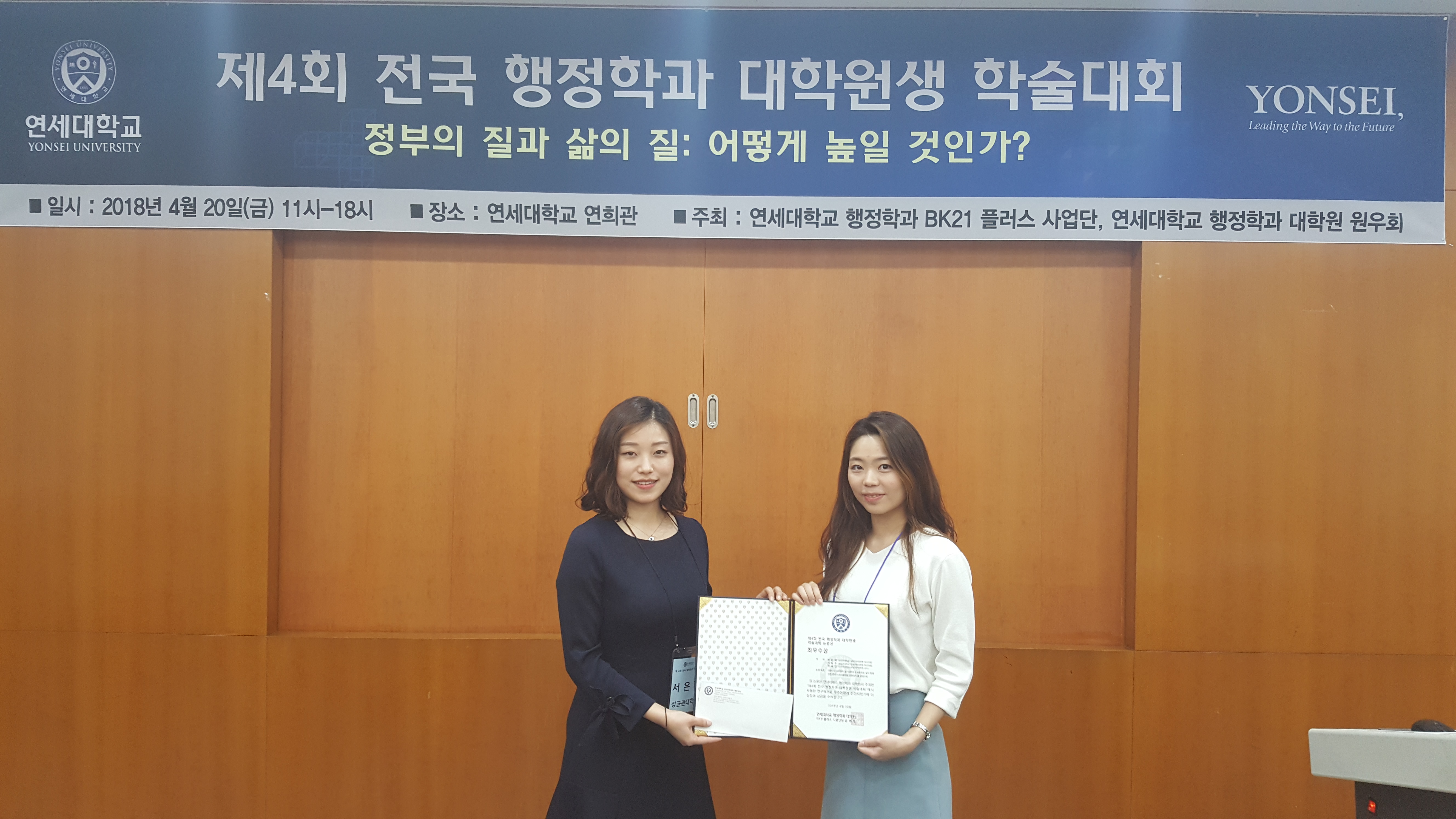 성균관대학교 국정전문대학원 공공인재개발연구센터 소속 서은혜, 이효주, 박성민(지도교수), 제4회 전국행정학과 대학원생 학술대회 최우수상 수상